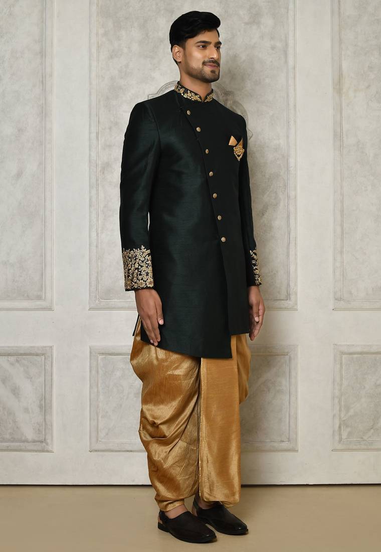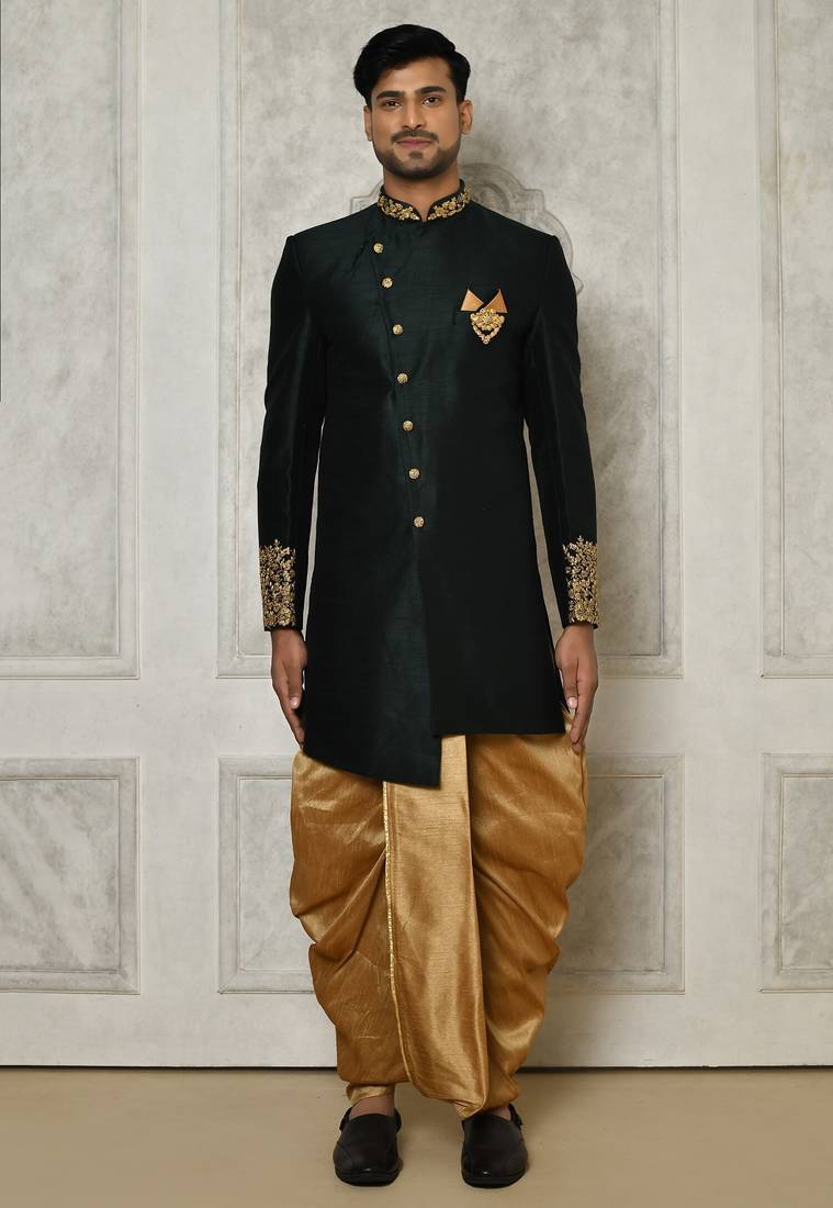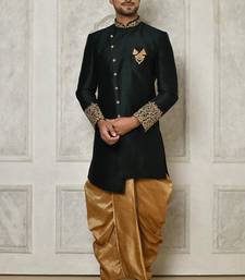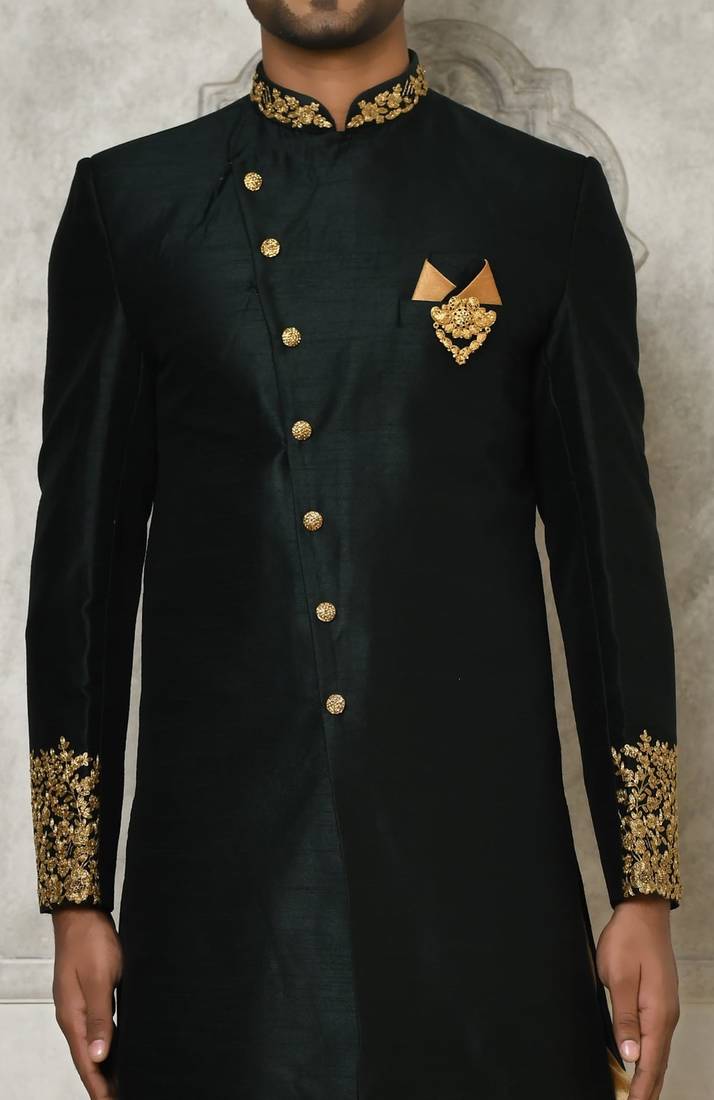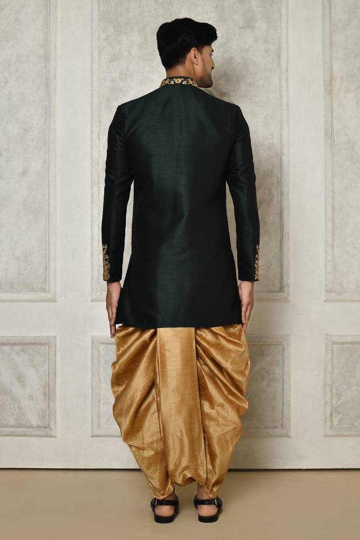 | Product Name | Bottle Green Dupion Arts Silk Anghrakha Design With Hand Work On Collar And Buttons Indo Western | |