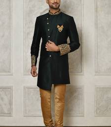 Bottle green dupion arts silk anghrakha design with hand work on collar and buttons indo western