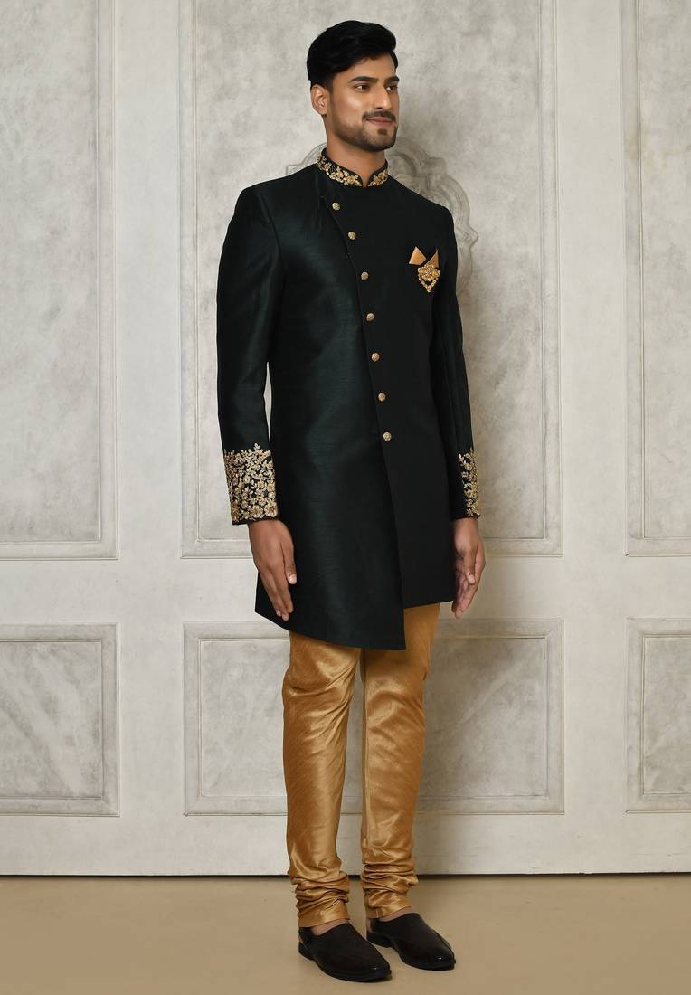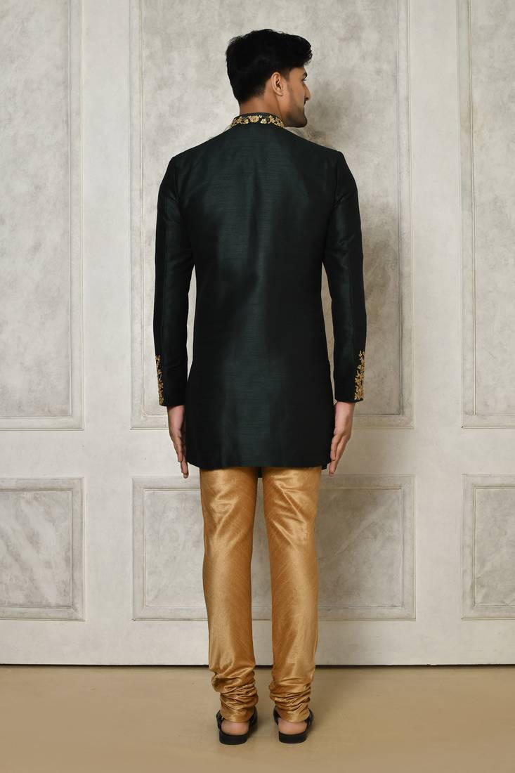 | Product Name | Bottle Green Dupion Arts Silk Anghrakha Design With Hand Work On Collar And Buttons Indo Western | |