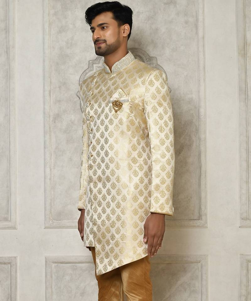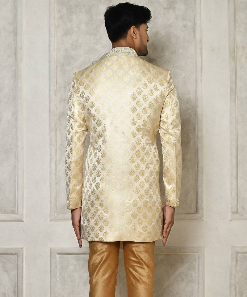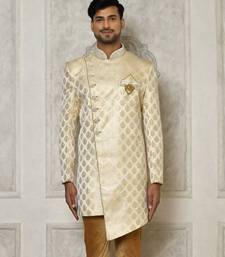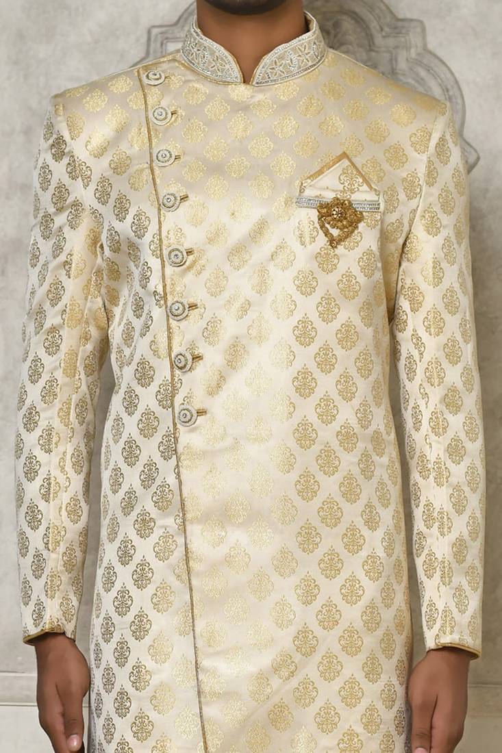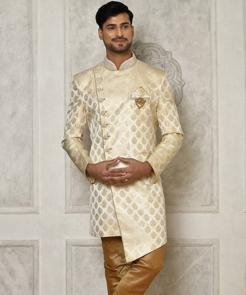 Cream dupion arts silk anghrakha design with hand work on collar and buttons indo western