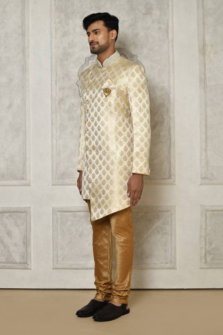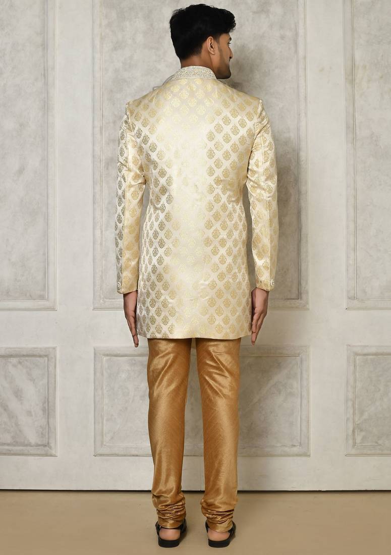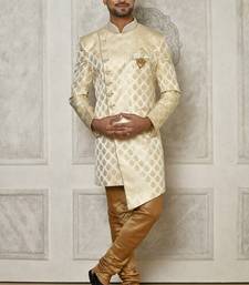 Cream dupion arts silk anghrakha design with hand work on collar and buttons indo western