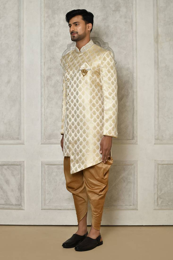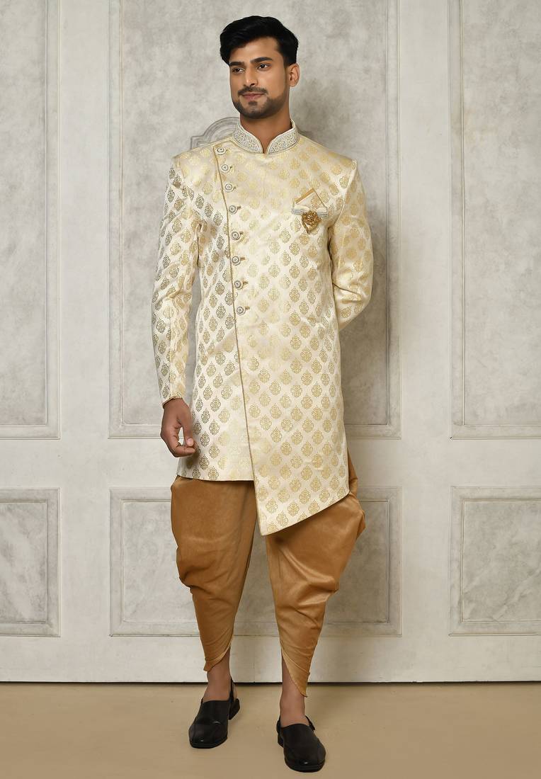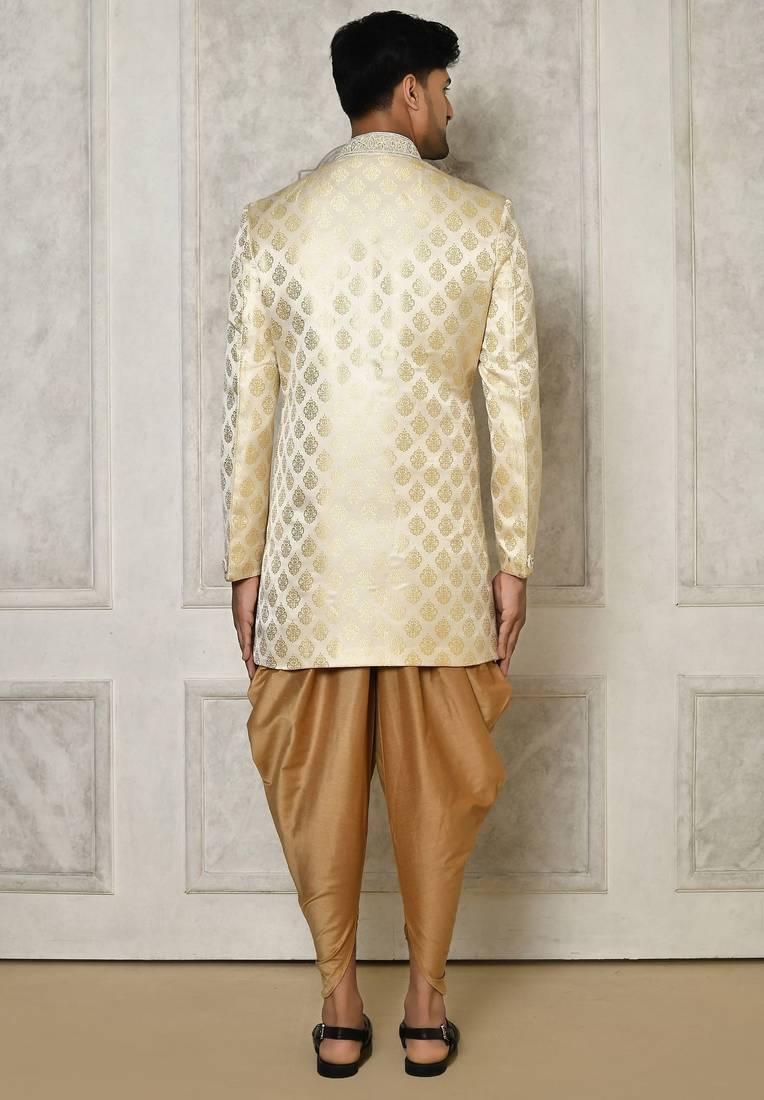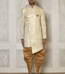 Cream dupion arts silk anghrakha design with hand work on collar and buttons indo western