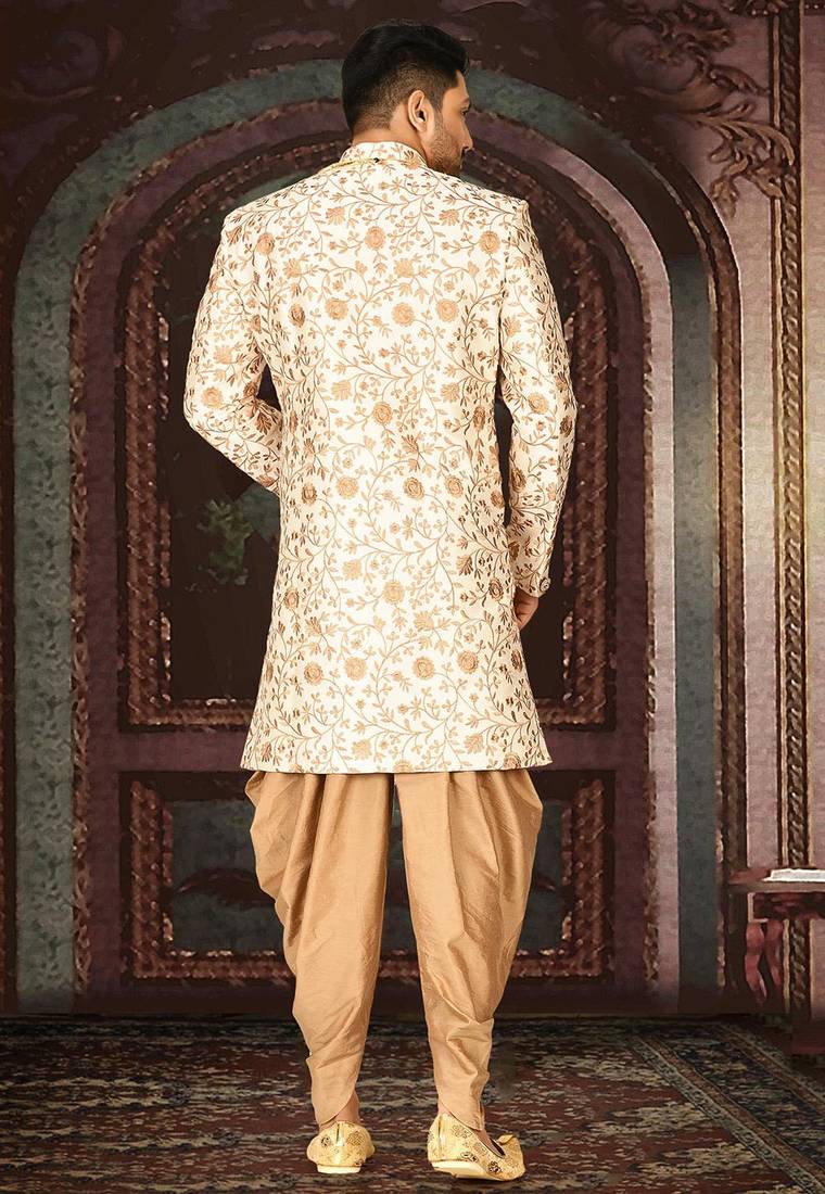 Cream dupion arts silk straight design with emb all over work indo western