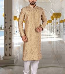 Dark beige dupion art silk kurta with computerised embroidery machine work churidar