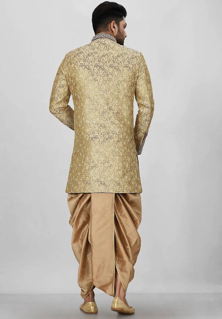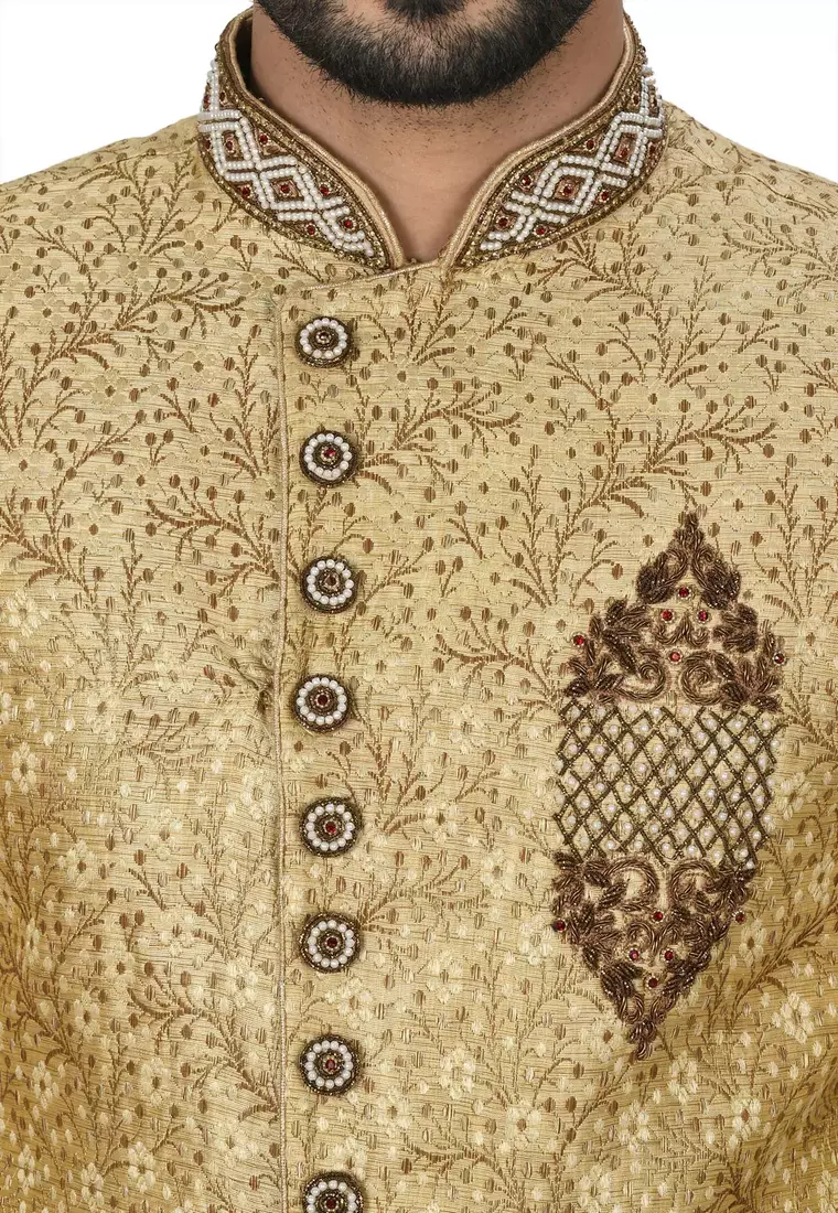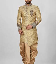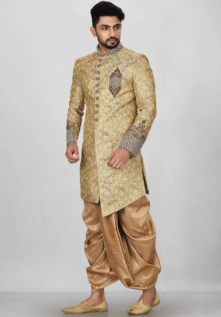 | Product Name | Gold Straight Pattern Work On Zari Jamewar Fabric With Hand Work On Collar ,Hand And Front Indo Western | |