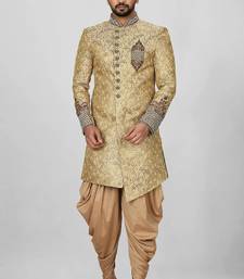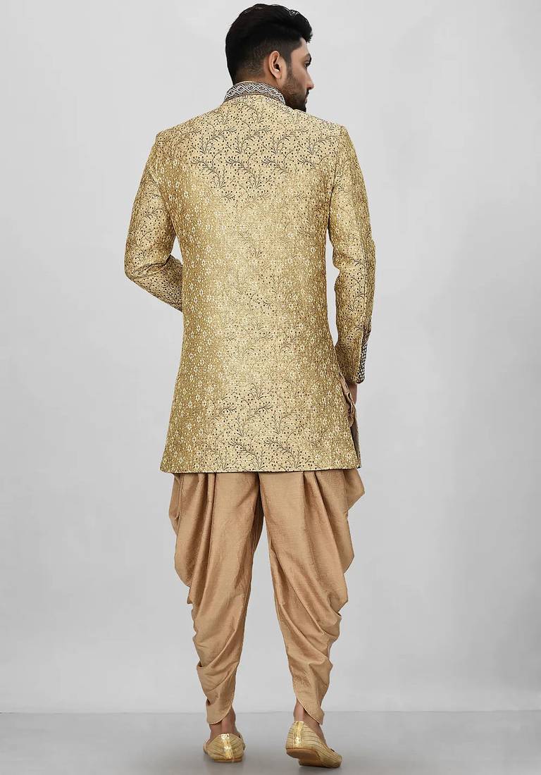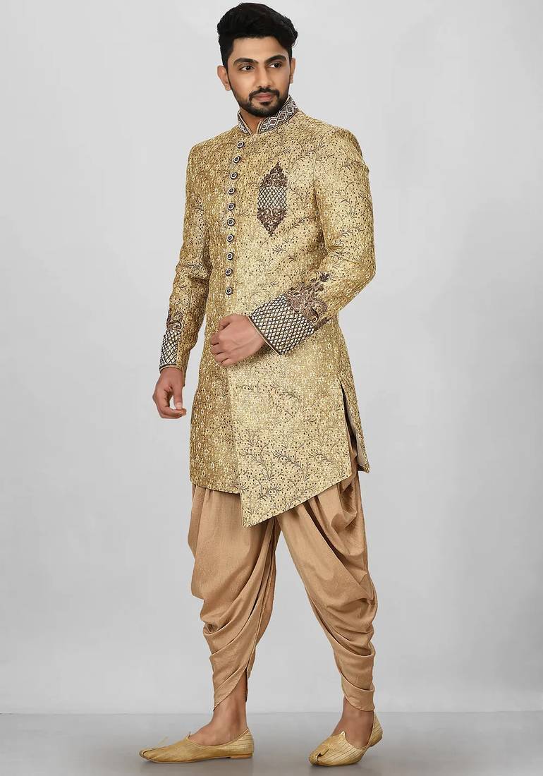 | Product Name | Gold Straight Pattern Work On Zari Jamewar Fabric With Hand Work On Collar ,Hand And Front Indo Western | |