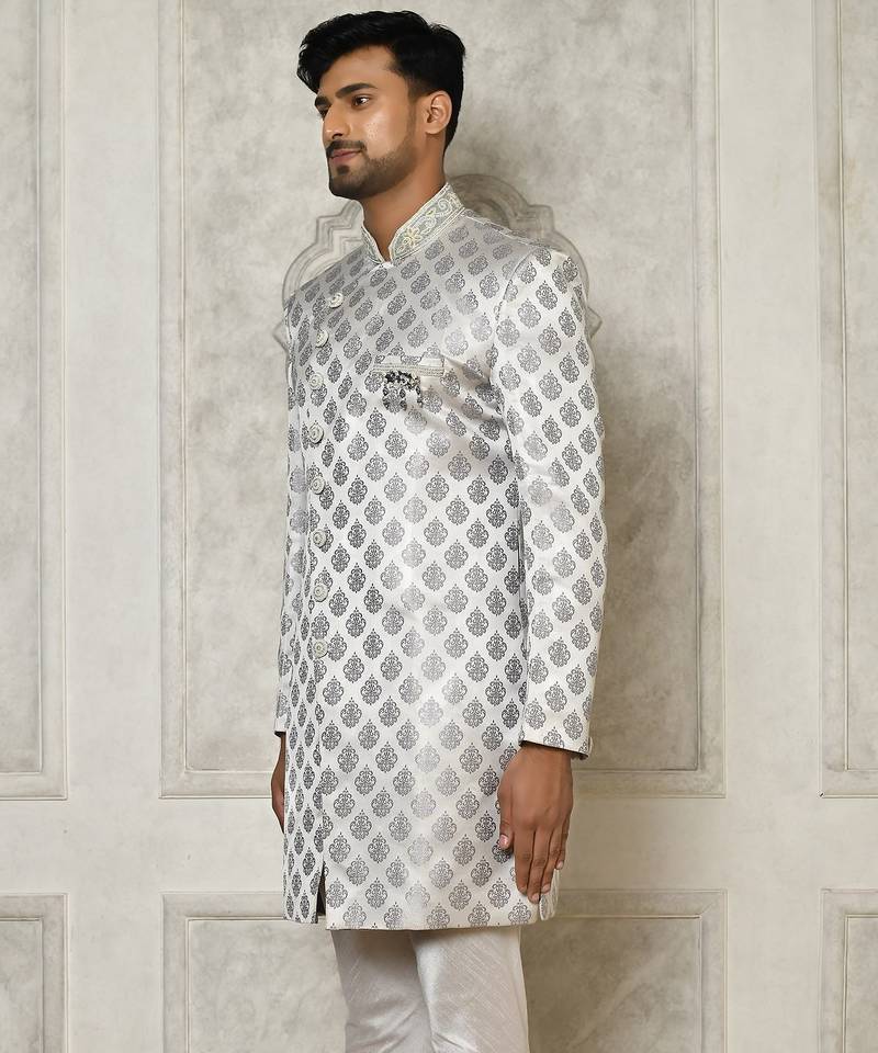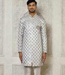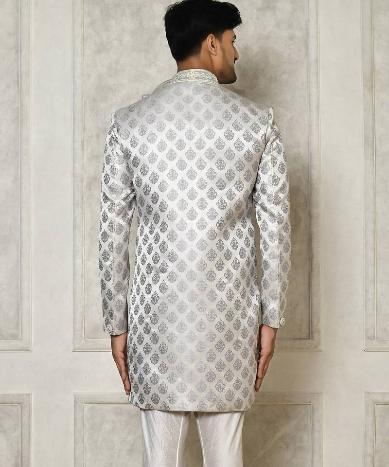 Grey dupion arts silk anghrakha design with hand work on collar and buttons indo western