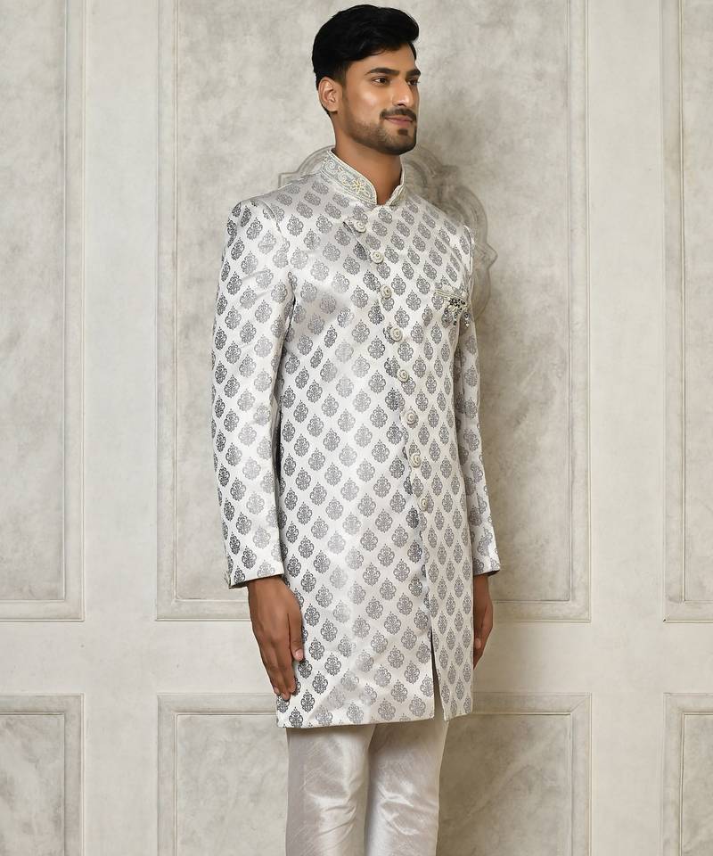 | Product Name | Grey Dupion Arts Silk Anghrakha Design With Hand Work On Collar And Buttons Indo Western | |