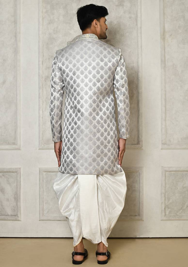 Grey dupion arts silk anghrakha design with hand work on collar and buttons indo western
