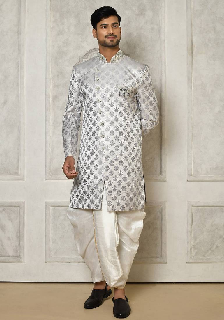 | Product Name | Grey Dupion Arts Silk Anghrakha Design With Hand Work On Collar And Buttons Indo Western | |