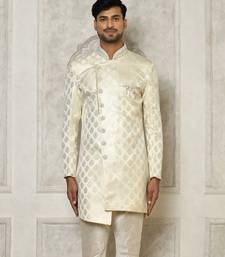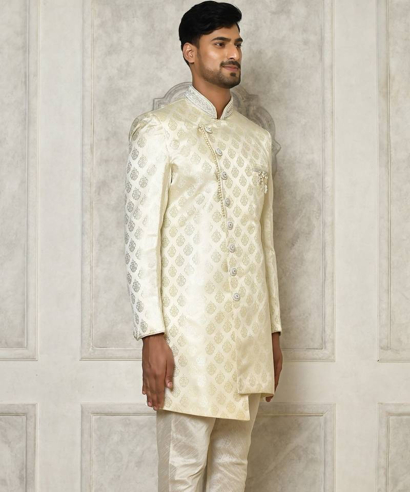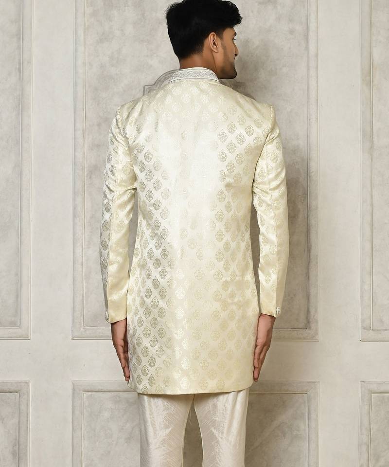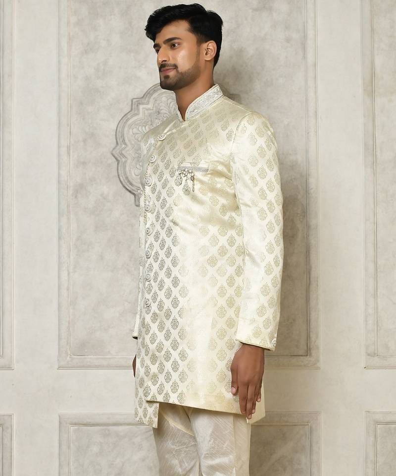 Ivory dupion arts silk anghrakha design with hand work on collar and buttons indo western