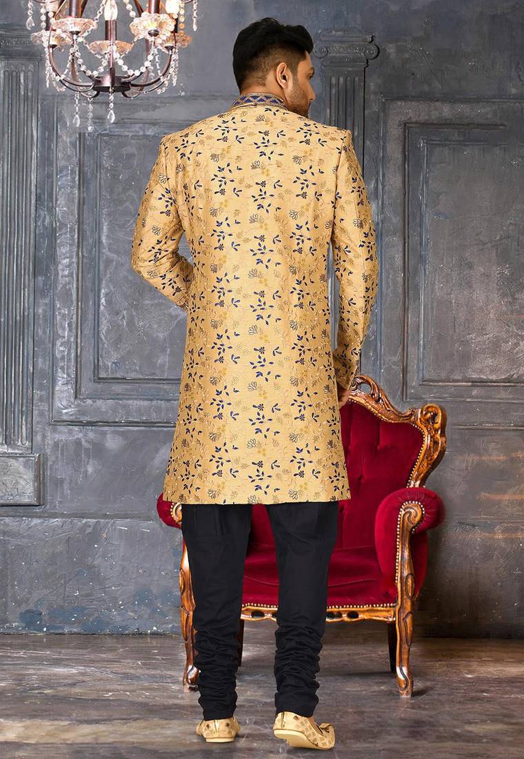 | Product Name | Light Beige Dupion Arts Silk Anghrakha Design With Hand Work On Collar And Buttons Indo Western | |
