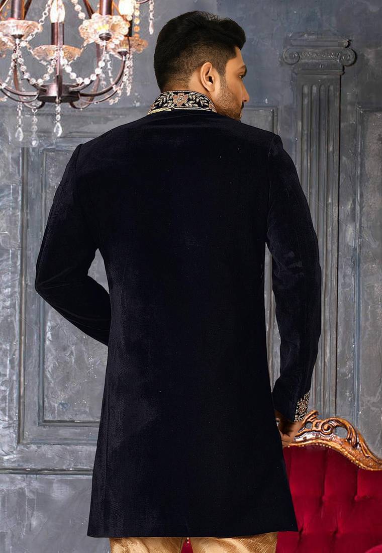 | Product Name | Navy Blue Navy Blue Velvet Anghrakha Design With Hand Work On Collar, Front And Hand Indo Western | |
