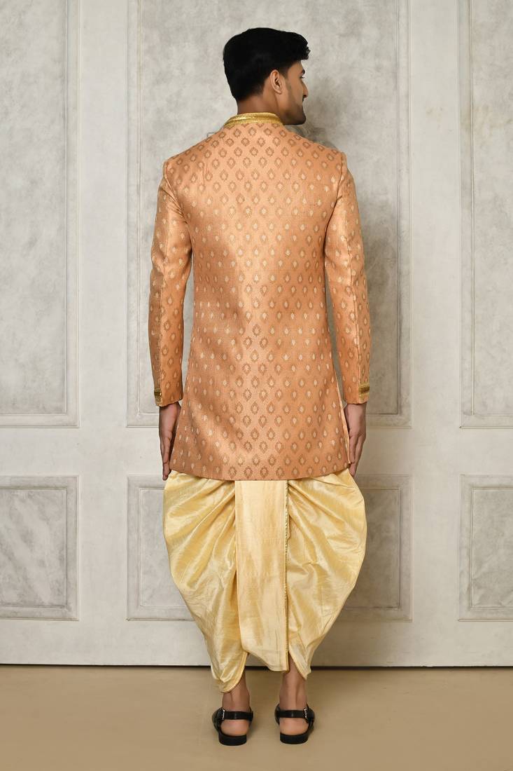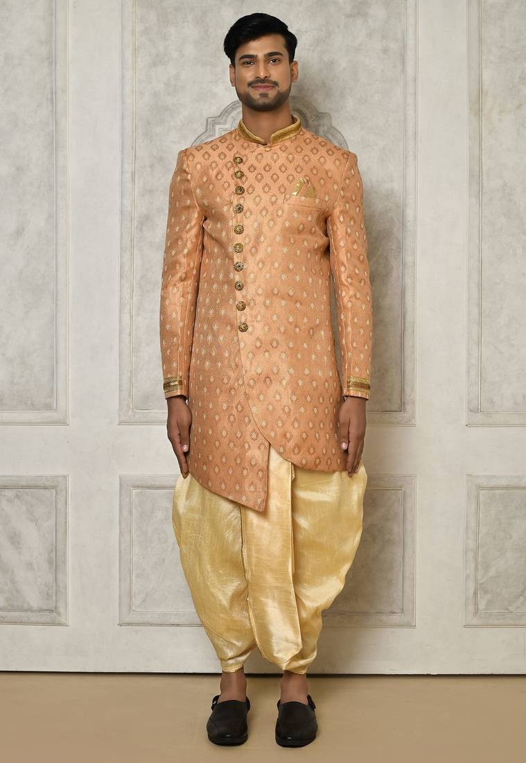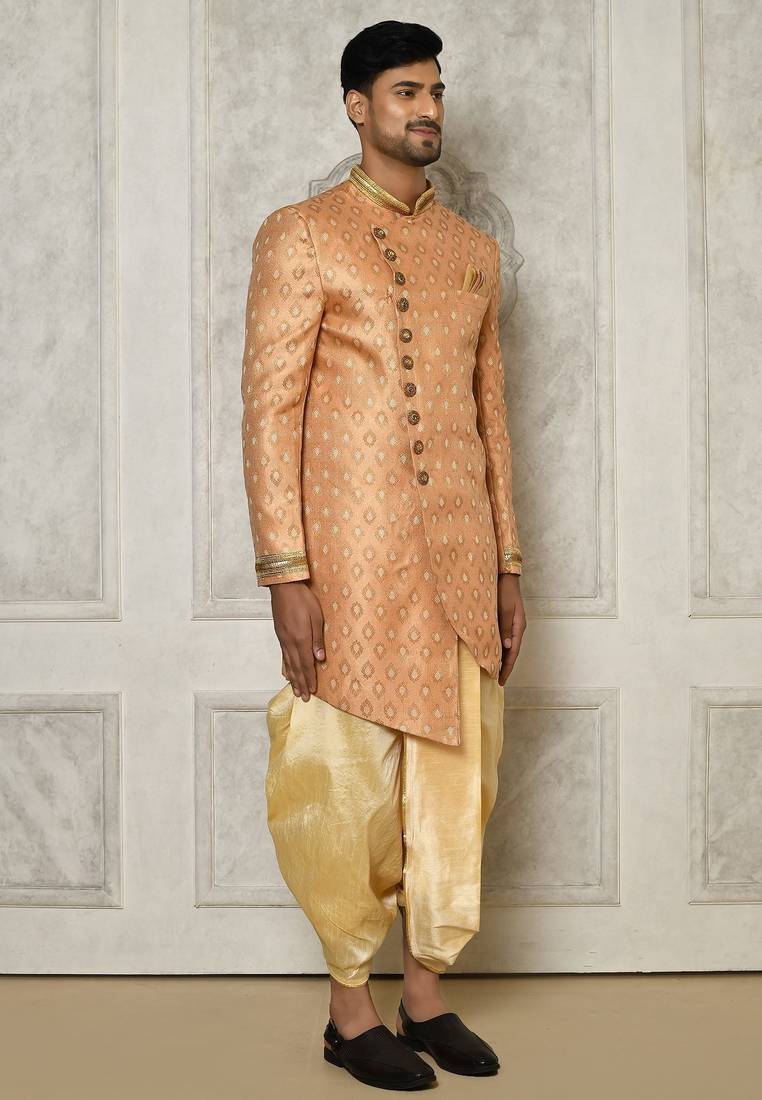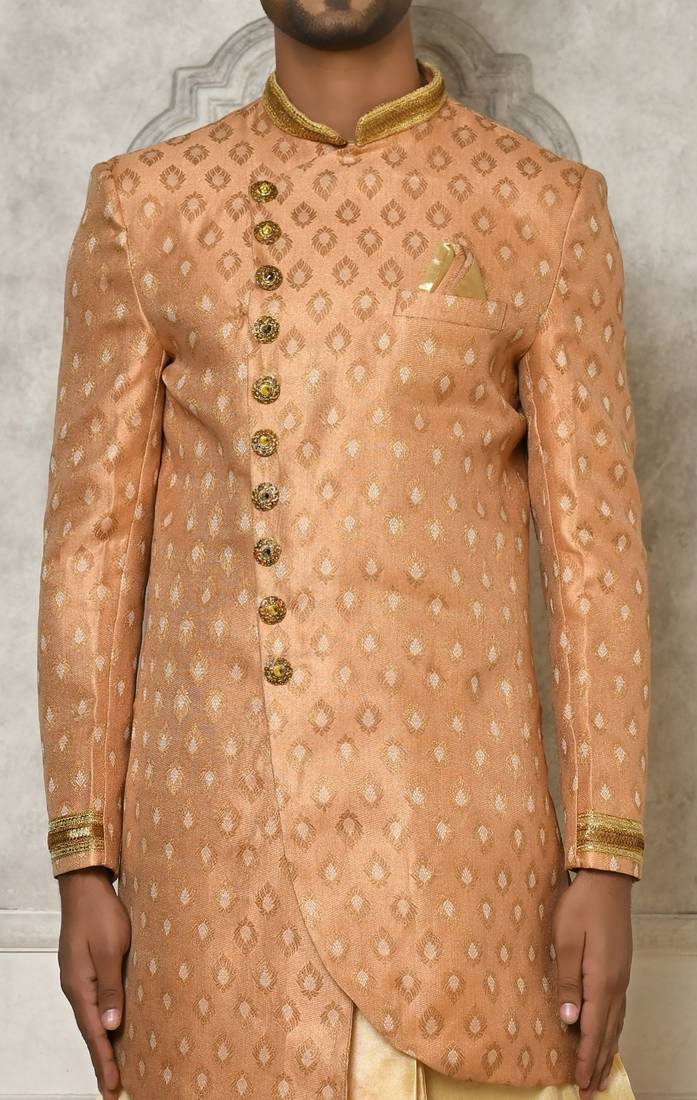 | Product Name | Peach Anghrakha Pattern Work With Hand Work On Collar And Pocket Indo Western | |