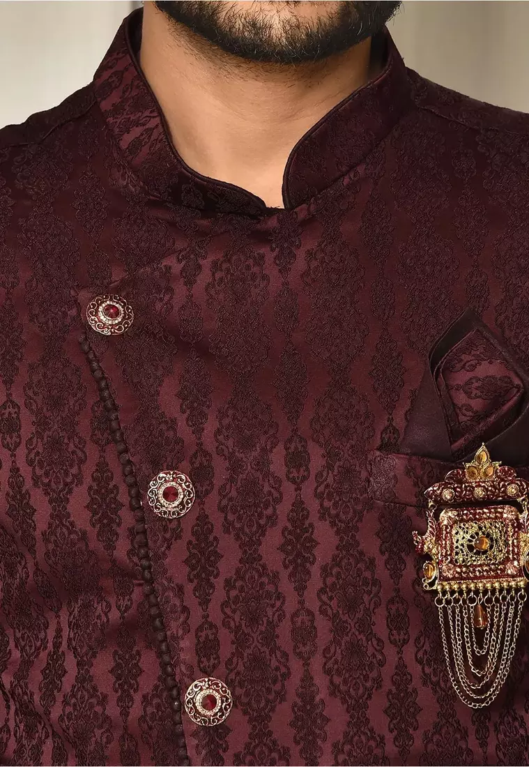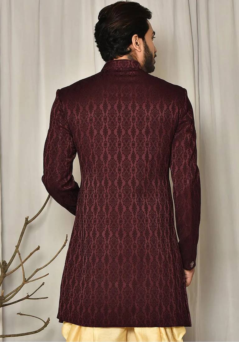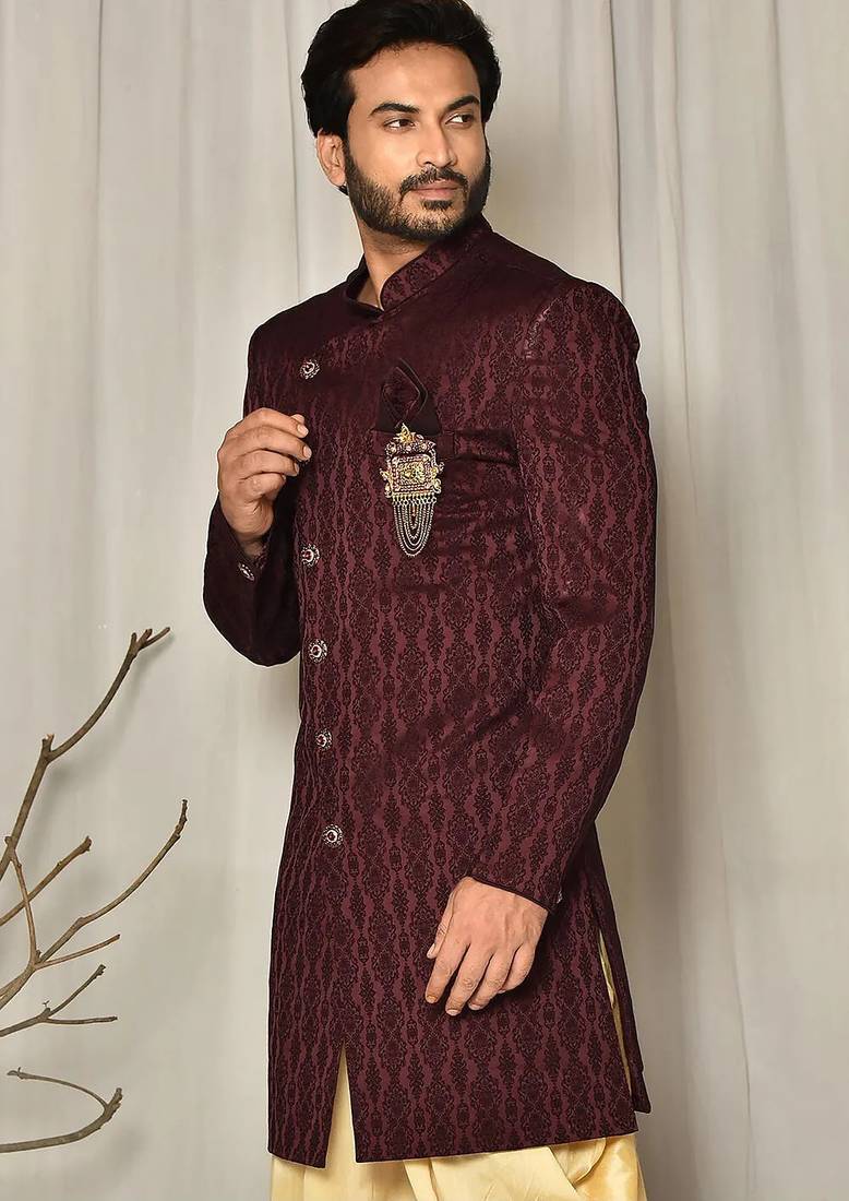 | Product Name | Peach Dupion Arts Silk Anghrakha Design With Hand Work On Collar And Buttons Indo Western | |