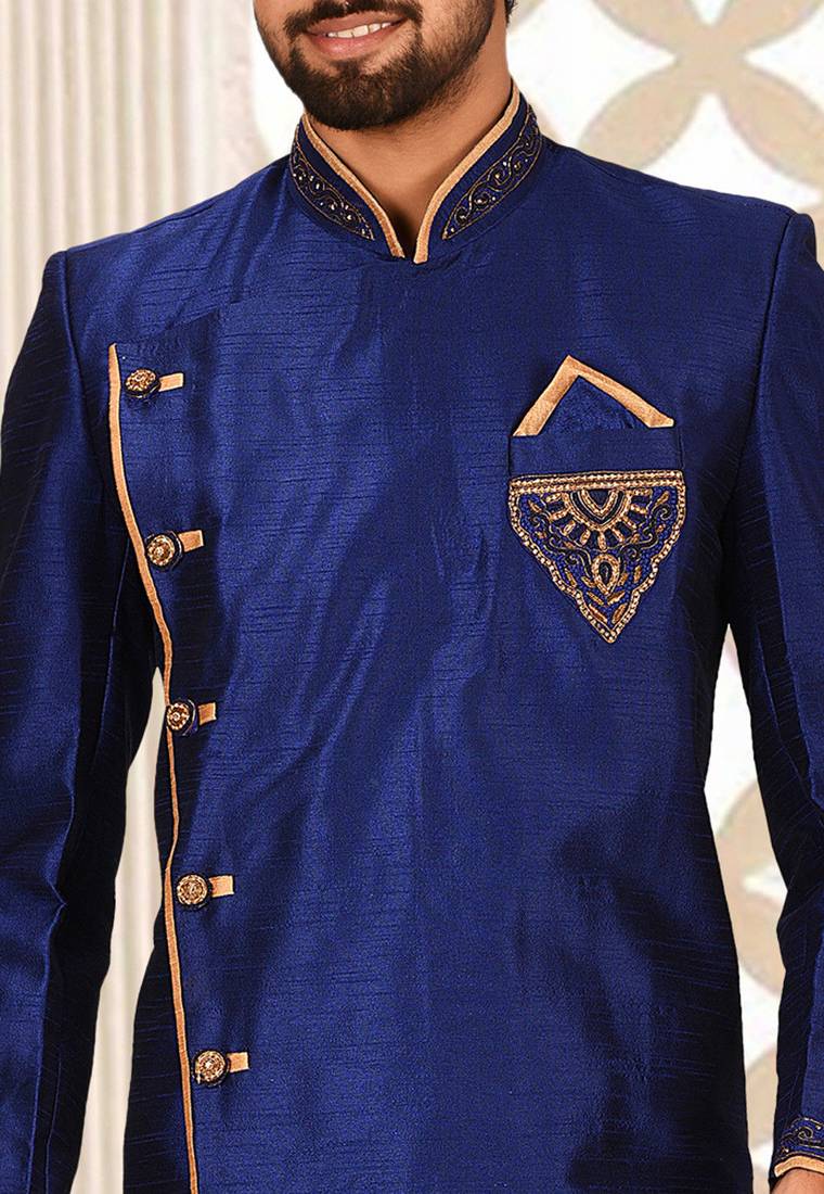 | Product Name | Royal Blue Dupion Arts Silk Anghrakha Design With Hand Work On Collar, Hand And Chest Pocket Indo Western | |