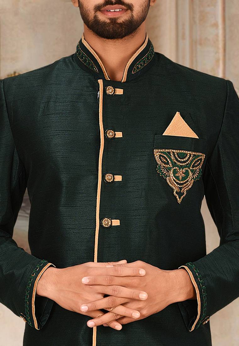| Product Description | Dupion Arts Silk Anghrakha Design With Hand Work On Collar, Hand And Chest Pocket |