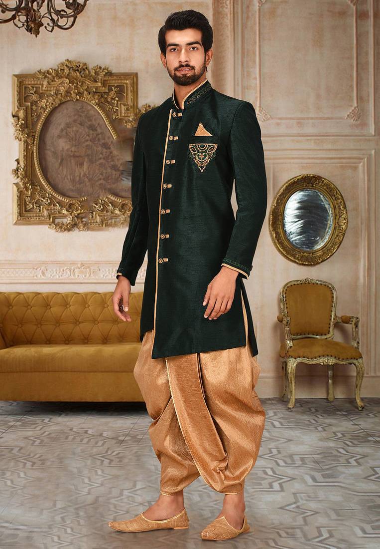 | Product Description | Dupion Arts Silk Anghrakha Design With Hand Work On Collar, Hand And Chest Pocket |