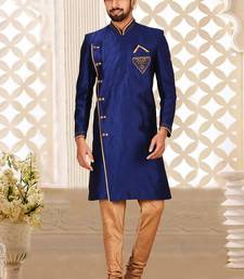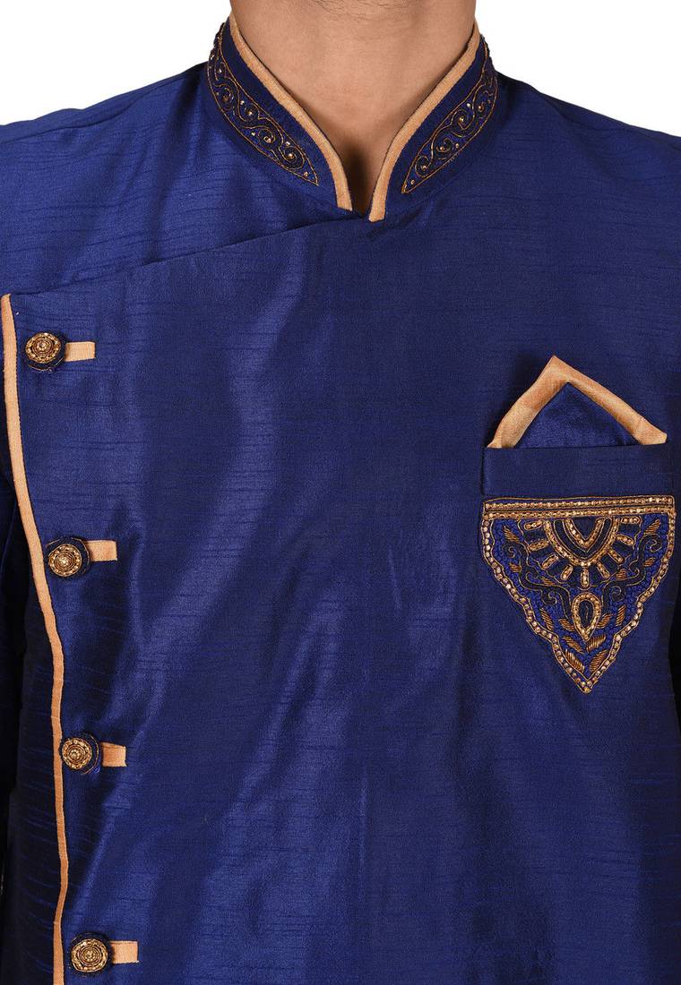 | Product Name | Royal Blue Dupion Arts Silk Anghrakha Design With Hand Work On Collar, Hand And Chest Pocket Indo Western | |