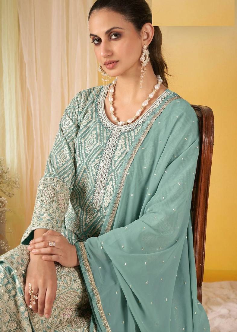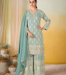Light blue real georgette wedding collection full stitched sharara suits free size upto 42