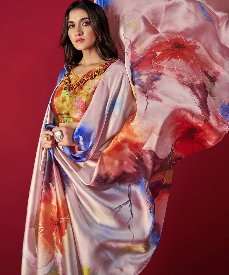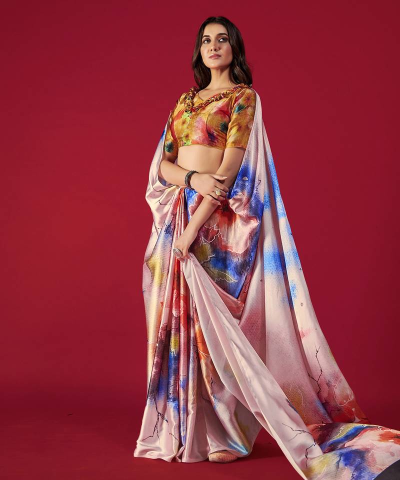 Printed satin saree with blouse piece