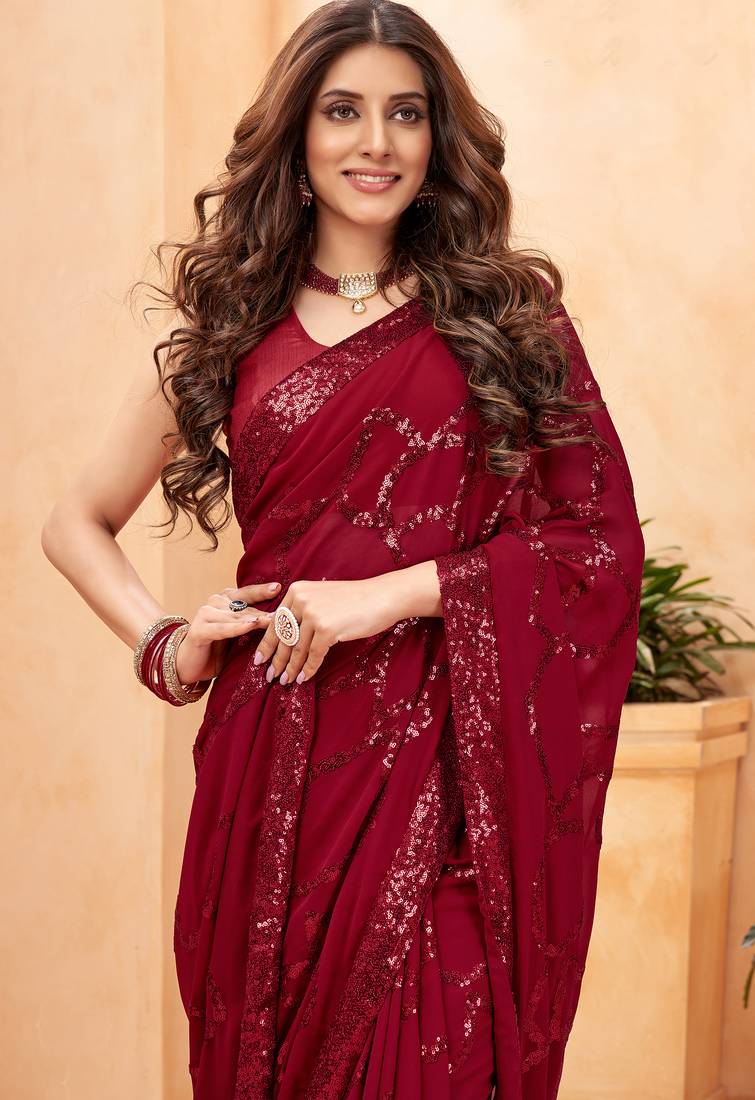 | • | Saree | : | Color- Maroon / Fabric- Faux Georgette |