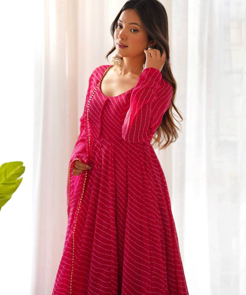 | Product Description | *Anarkali Fabric*: Heavy Pure Fox Georgette Laheriya Print *Fancy Neck Potli Button Design,Churidar Sleevs,Padded,Zipper Attached* *Anarkali Flair*: 4 Mtr Approx Fully Flair *Anarkali Inner*: Pure Micro Cotton Full Lining With Canvas Patta Attached Flair *Dupatta Work*: 2.3 Mtr Pure Fox Laheriya Print With Boader Triangle Lace Work *Duppta Width*: 27 Inch Shawl Style Duppta *Anarkali Length*:48 Inch Approx *Pent Fabric*:Pure Micro Cotton Silk Free Size Fully Sttiched *Size* :Xs(34) S(36) M(38) L(40) Xl(42) And Xxl(44) |