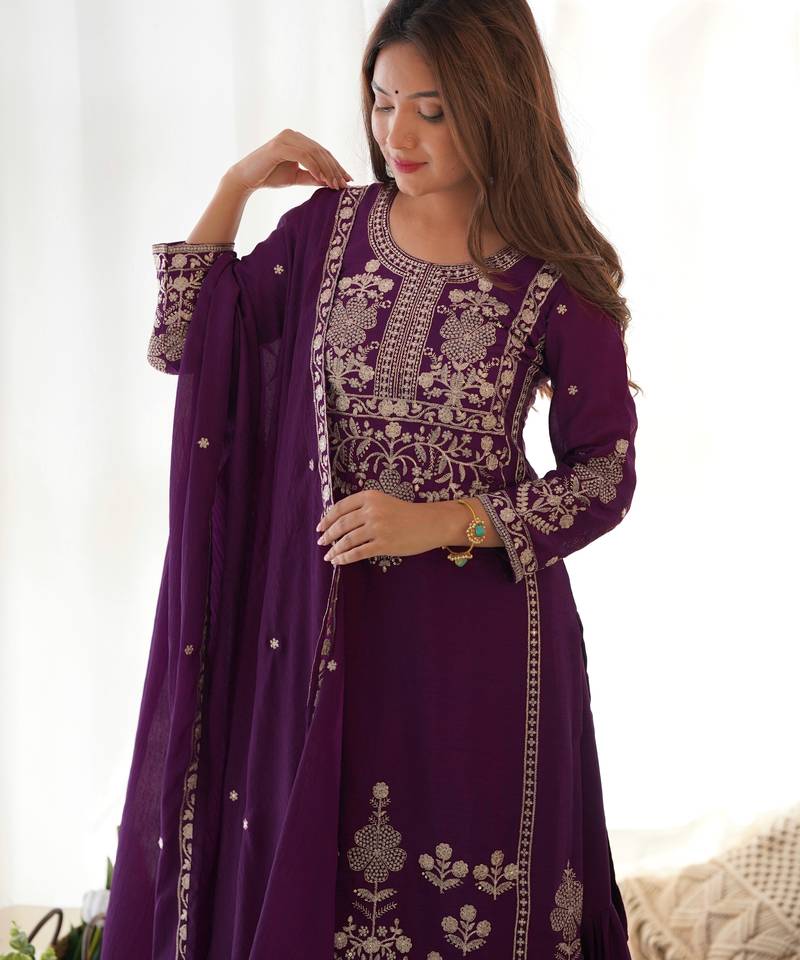 | • | Dupatta | : | Color- Purple / Fabric- Silk |