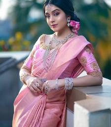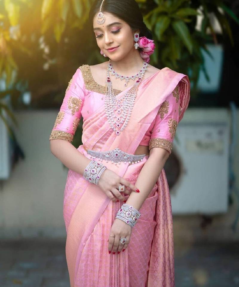 Baby pink soft silk blend banarasi jacuard work designer party wear saree with unstitched blouse piece