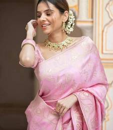 Baby pink soft silk blend banarasi jacuard work designer party wear saree with unstitched blouse piece