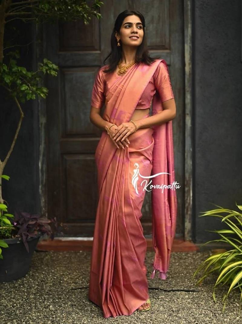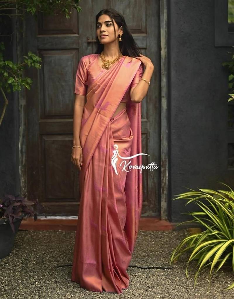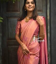 Baby pink soft silk blend banarasi jacuard work designer party wear saree with unstitched blouse piece