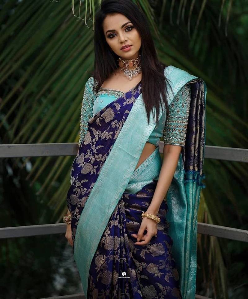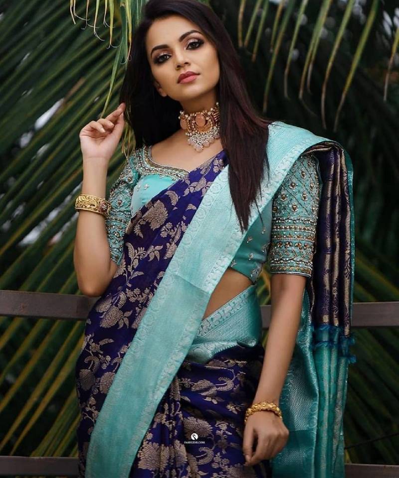 | • | Saree | : | Color- Blue / Fabric- Silk Blend |