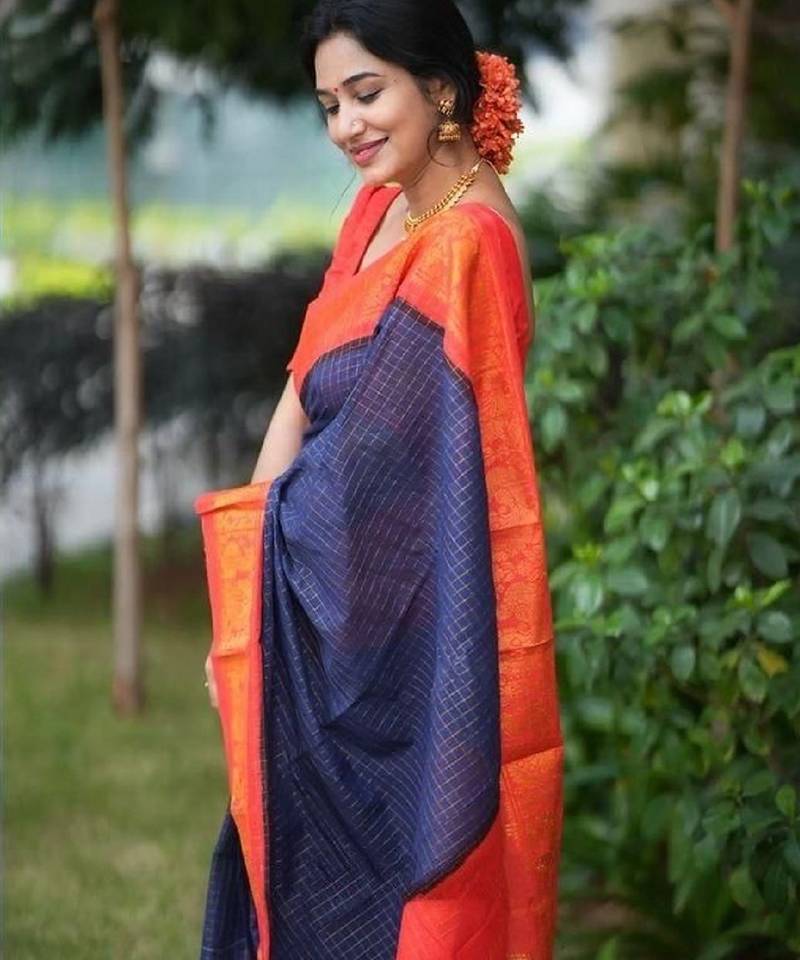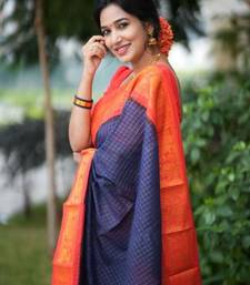 Blue red soft silk blend banarasi jacuard work designer party wear saree with unstitched blouse piece