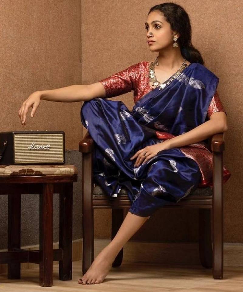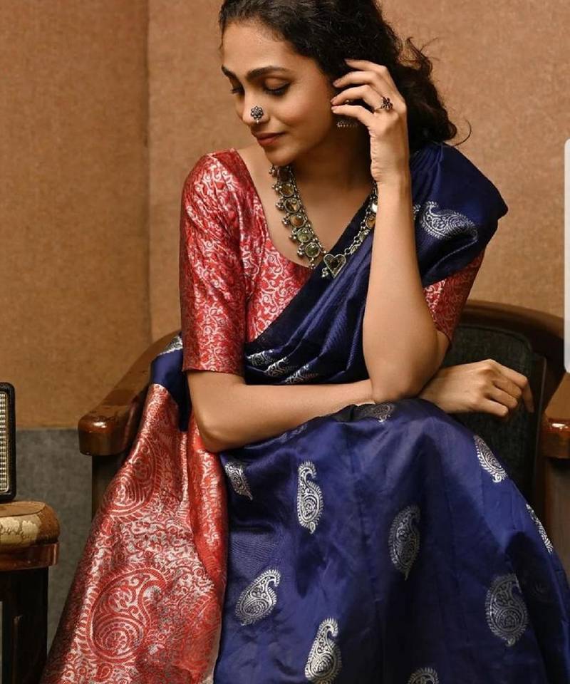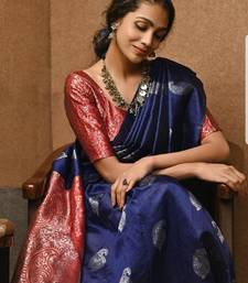 Blue red soft silk blend banarasi jacuard work designer party wear saree with unstitched blouse piece