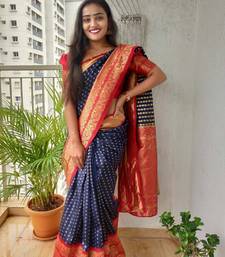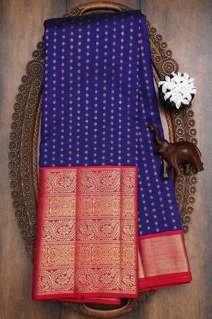 Blue red soft silk blend banarasi jacuard work designer party wear saree with unstitched blouse piece
