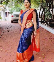 Blue red soft silk blend banarasi jacuard work designer party wear saree with unstitched blouse piece
