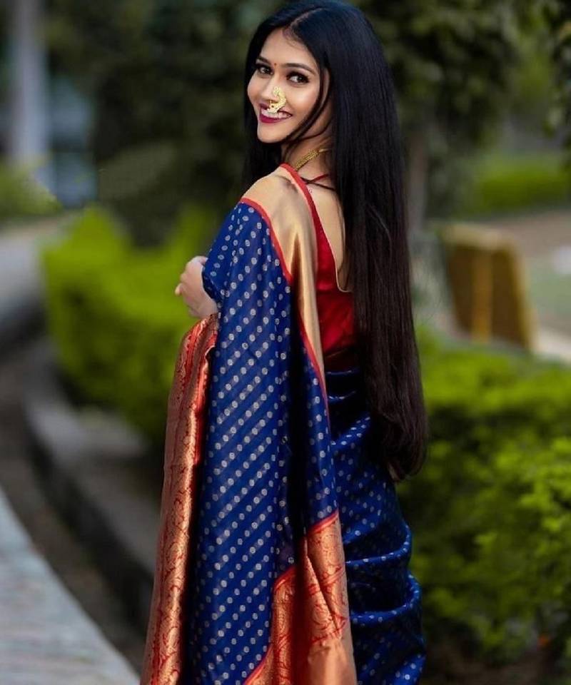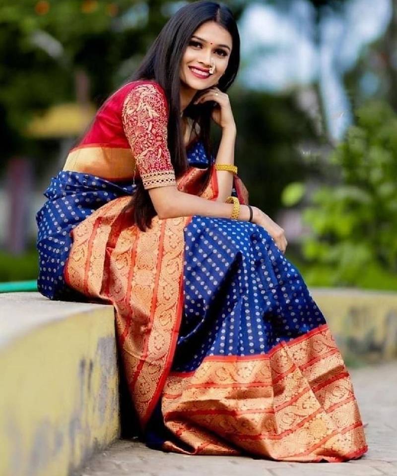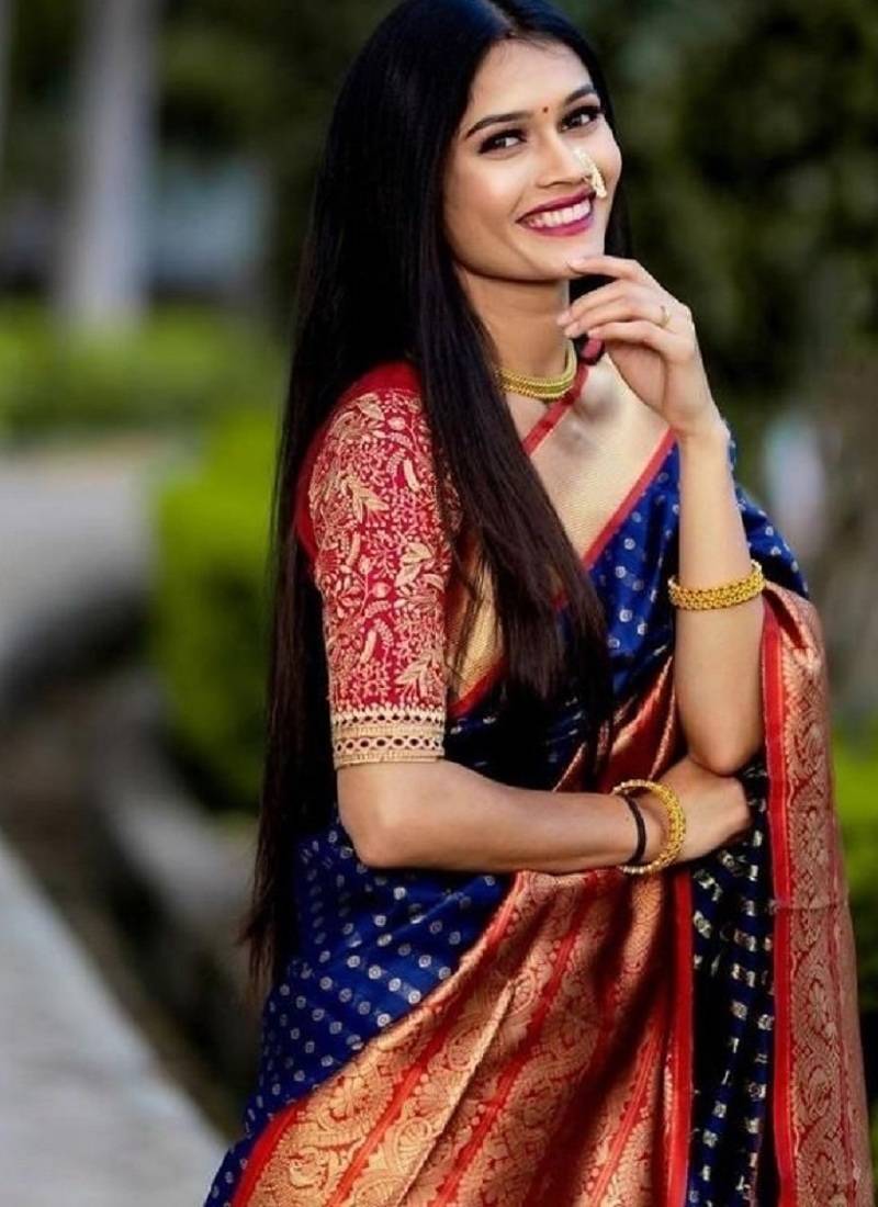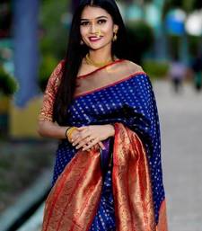 Blue red soft silk blend banarasi jacuard work designer party wear saree with unstitched blouse piece