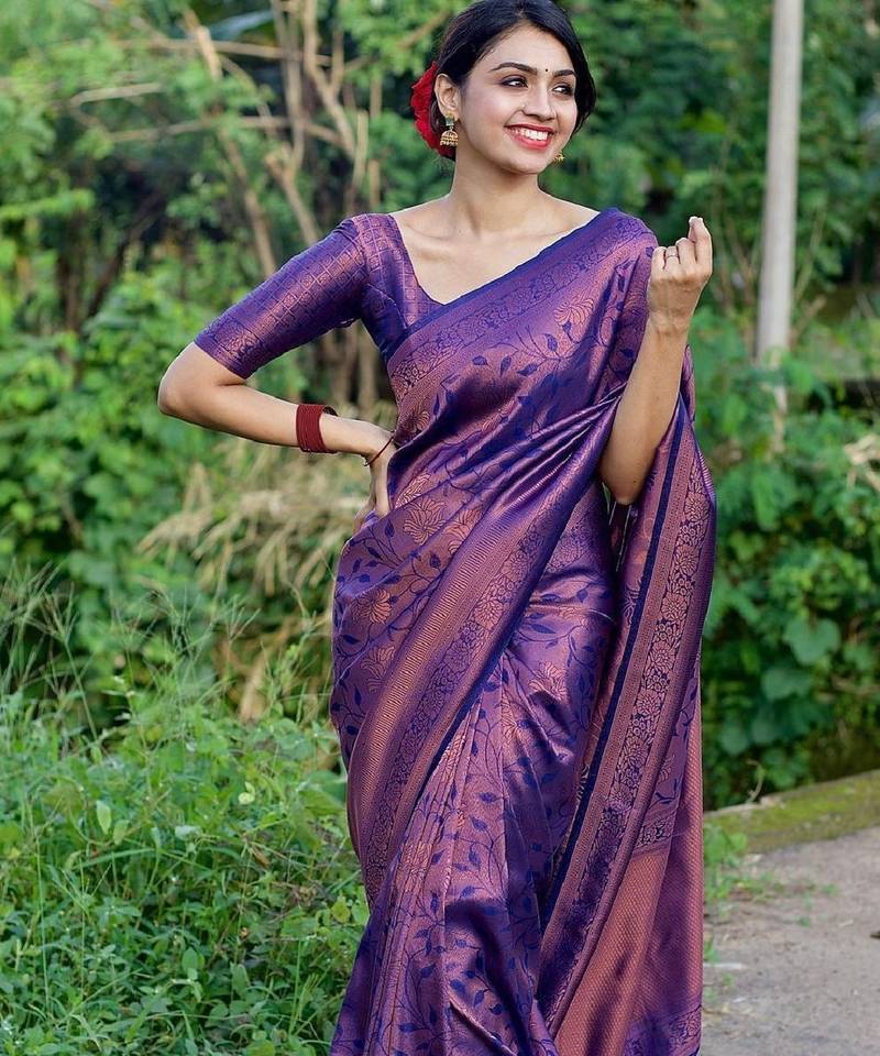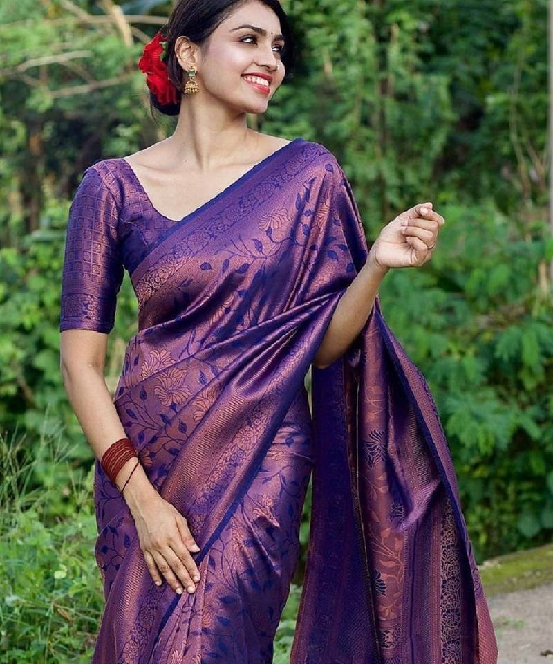 Blue soft silk blend banarasi jacuard work designer party wear saree with unstitched blouse piece