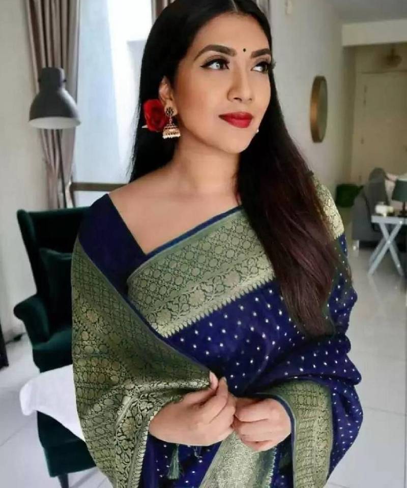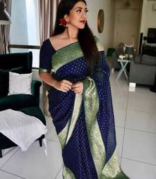 Blue soft silk blend banarasi jacuard work designer party wear saree with unstitched blouse piece