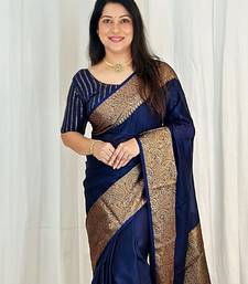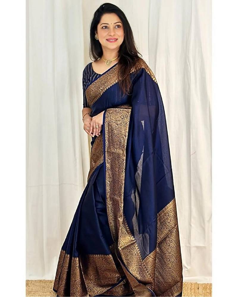 Blue soft silk blend banarasi jacuard work designer party wear saree with unstitched blouse piece