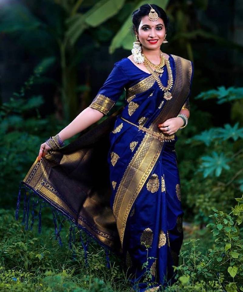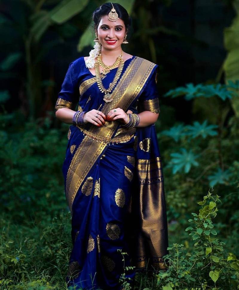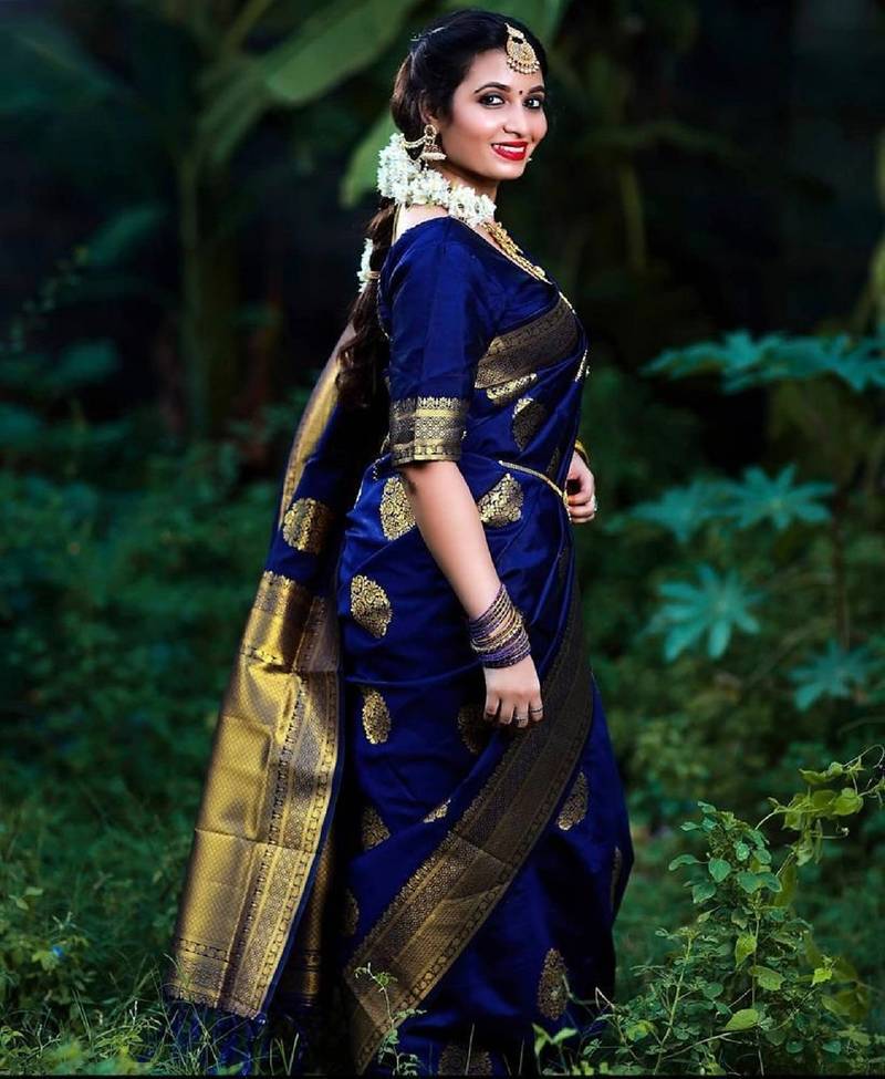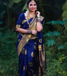 Blue soft silk blend banarasi jacuard work designer party wear saree with unstitched blouse piece