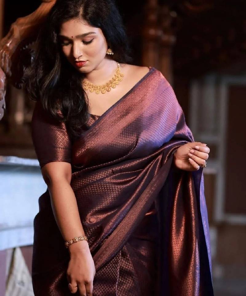 Design Details The Saree Features A Soft Peach Base Adorned With Delicate Woven Motifs That Enhance Its Royal Charm. The Rich Wine Colored Border And Pallu Are Intricately Designed With Traditional Banarasi Zari Weaving, Adding Depth, Contrast, And Grandeur To The Overall Look. The Ornate Zari Work Reflects Classic Heritage Craftsmanship, Making This Saree Ideal For Festive Occasions, Weddings, Cultural Events, And Celebrations. Blouse Details