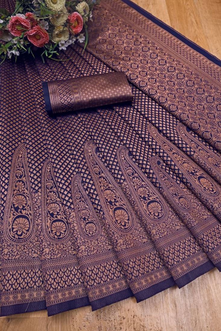 Blue soft silk blend banarasi jacuard work designer party wear saree with unstitched blouse piece
