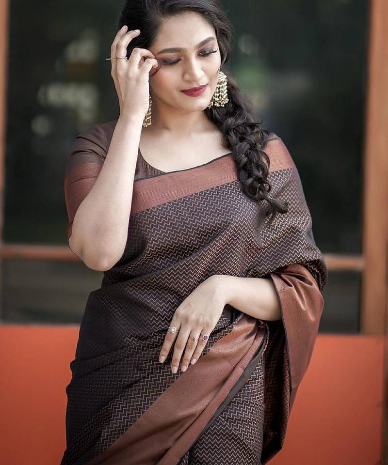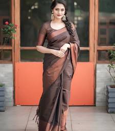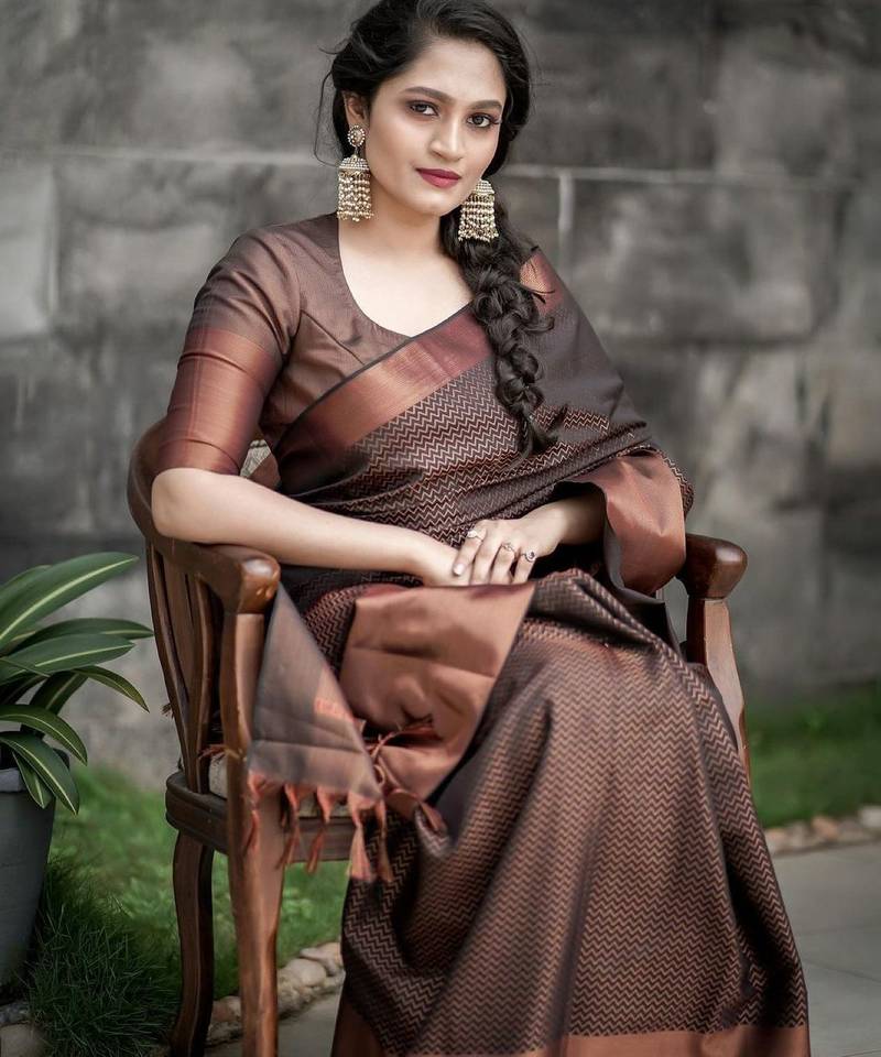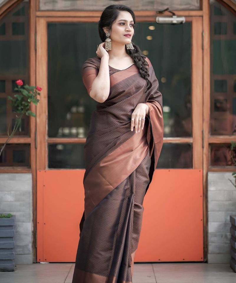 Brown soft silk blend banarasi jacuard work designer party wear saree with unstitched blouse piece