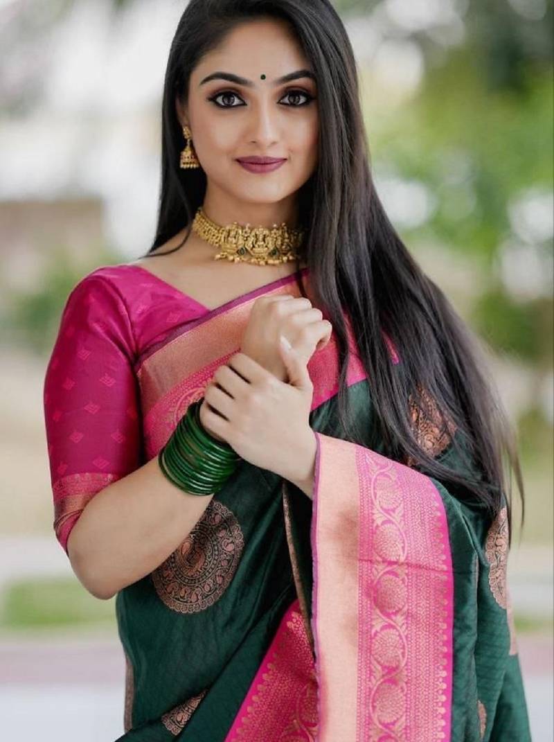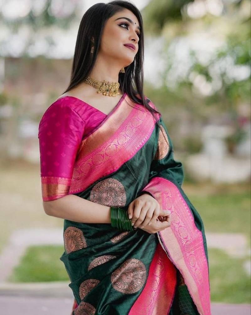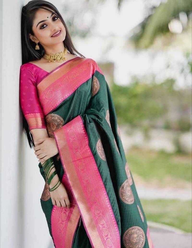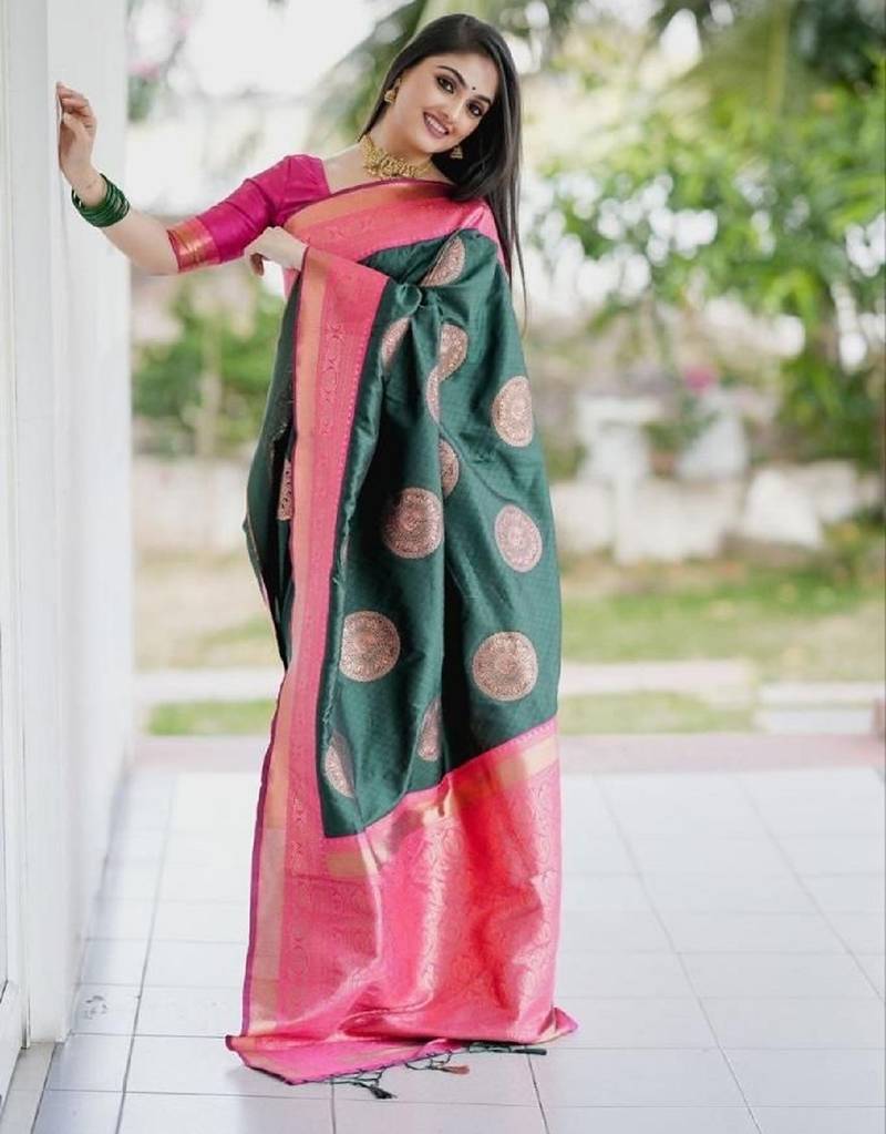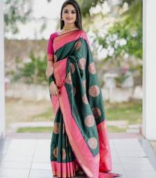 Green pink soft silk blend banarasi jacuard work designer party wear saree with unstitched blouse piece