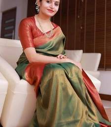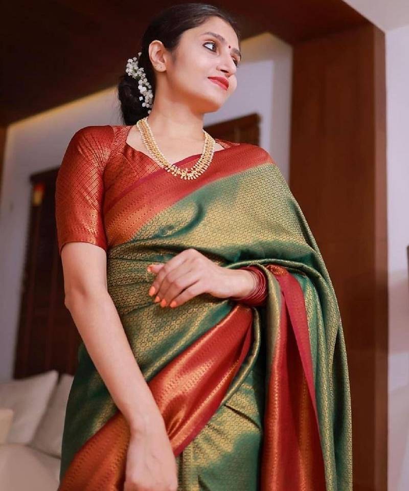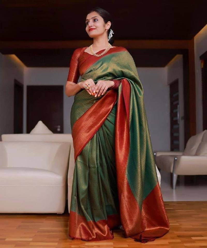 Green red soft silk blend banarasi jacuard work designer party wear saree with unstitched blouse piece