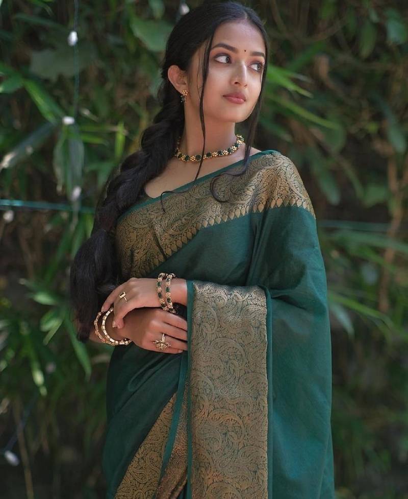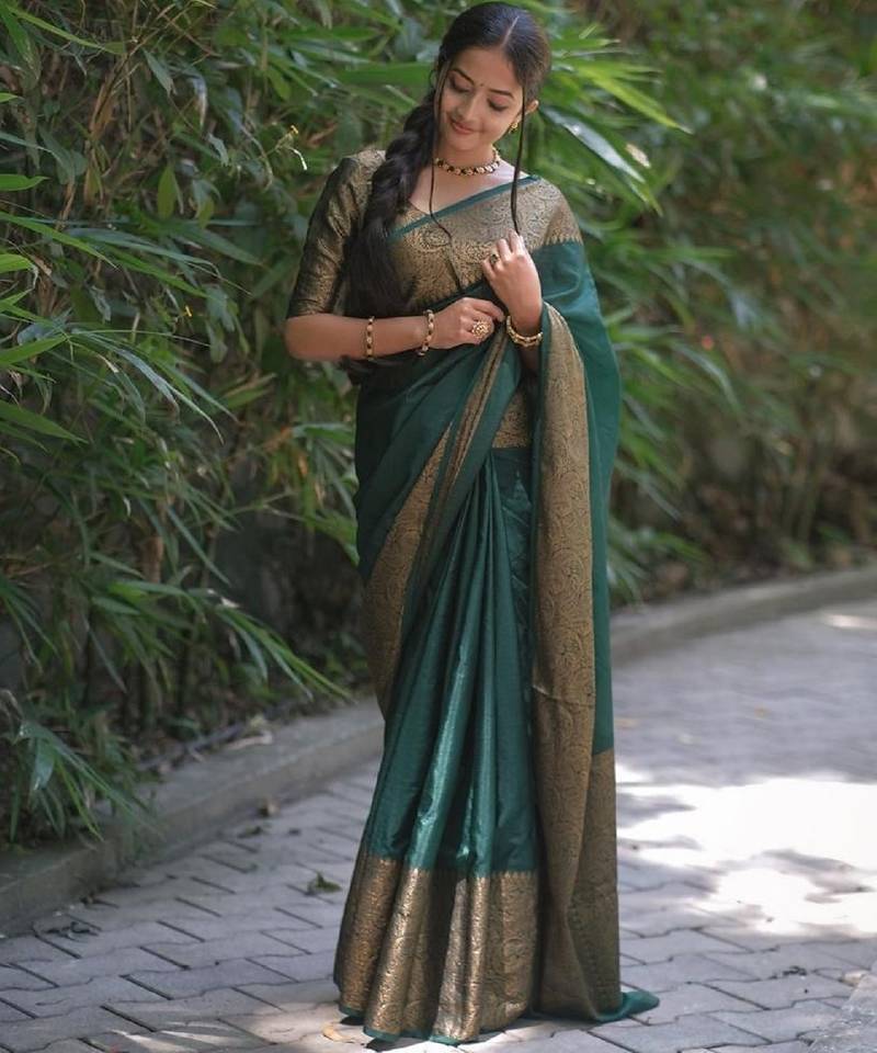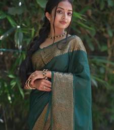 Green soft silk blend banarasi jacuard work designer party wear saree with unstitched blouse piece