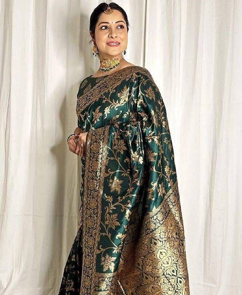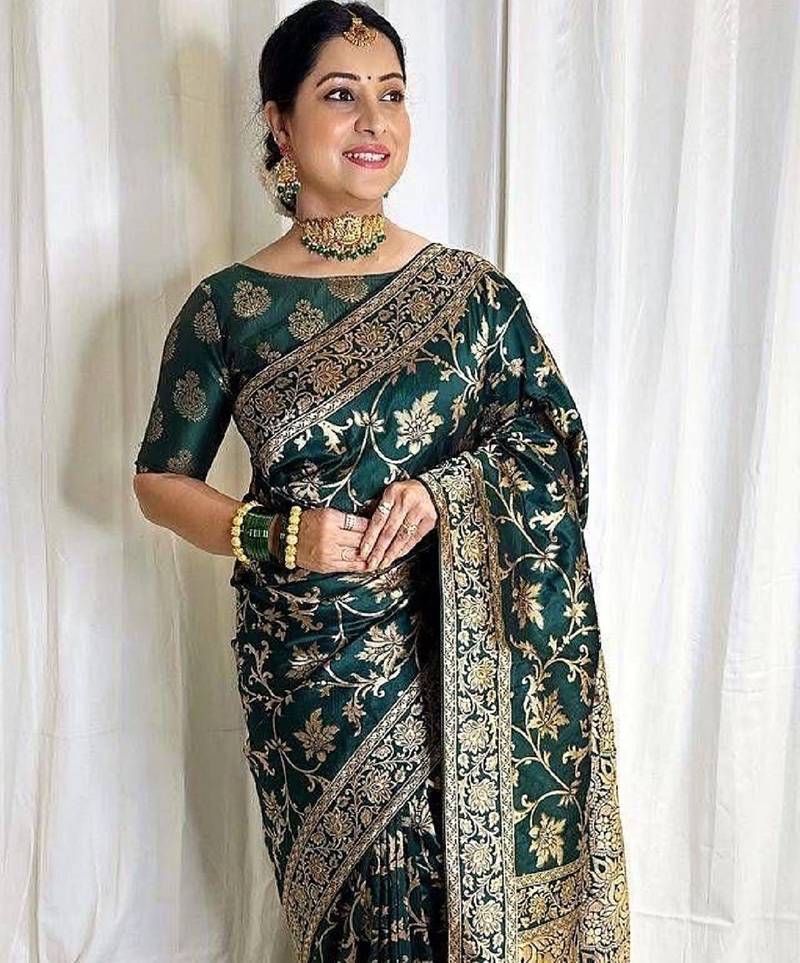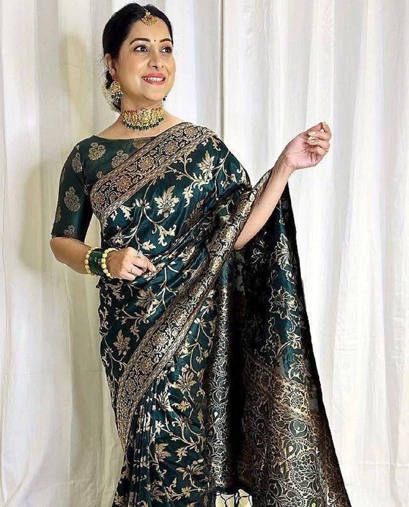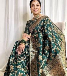 Green soft silk blend banarasi jacuard work designer party wear saree with unstitched blouse piece