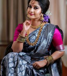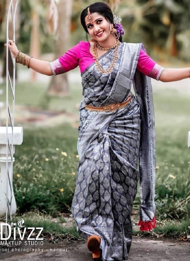 Grey soft silk blend banarasi jacuard work designer party wear saree with unstitched blouse piece