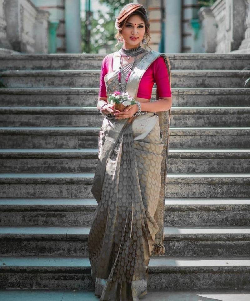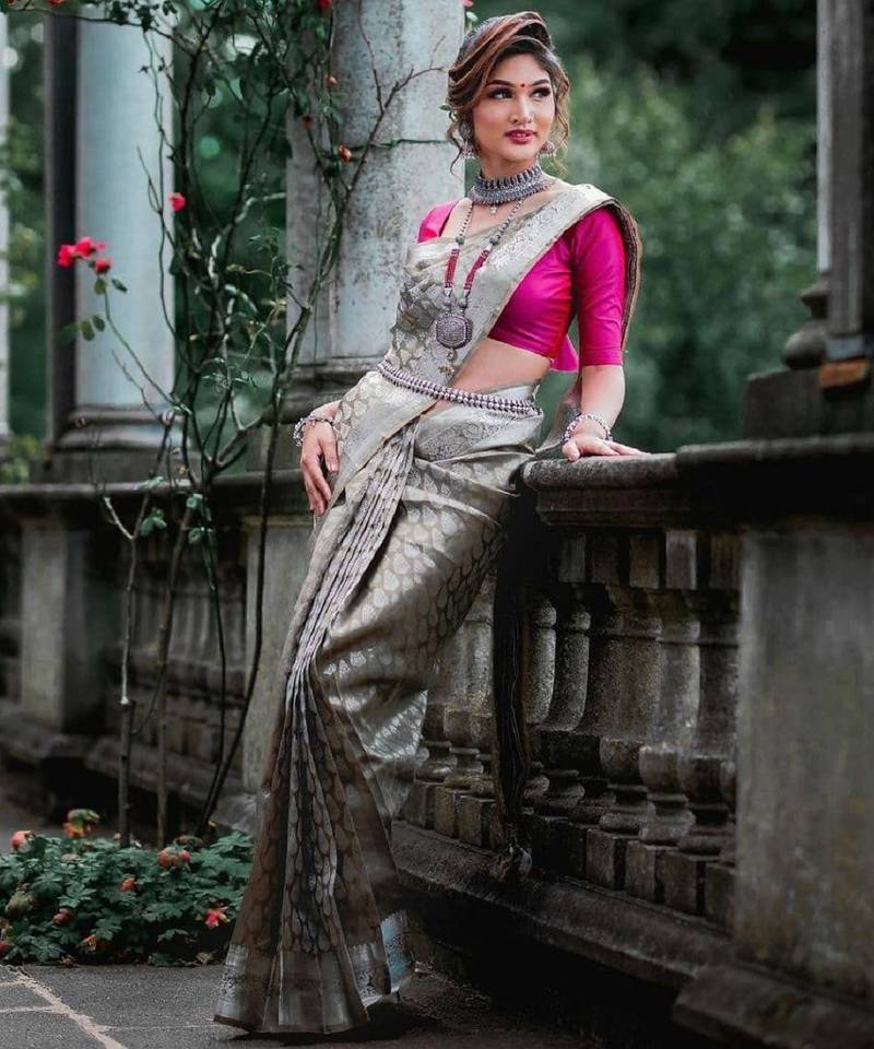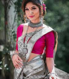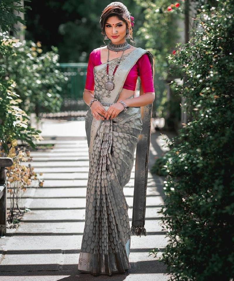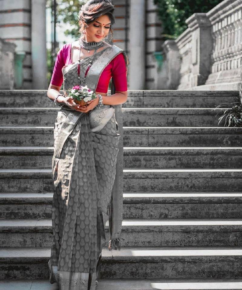 Grey soft silk blend banarasi jacuard work designer party wear saree with unstitched blouse piece